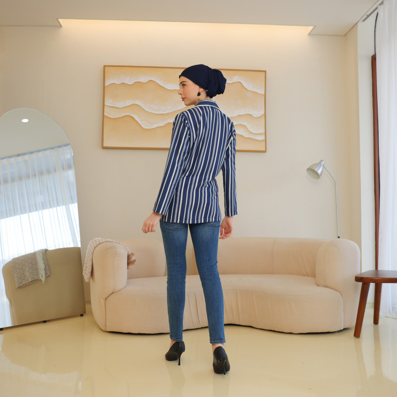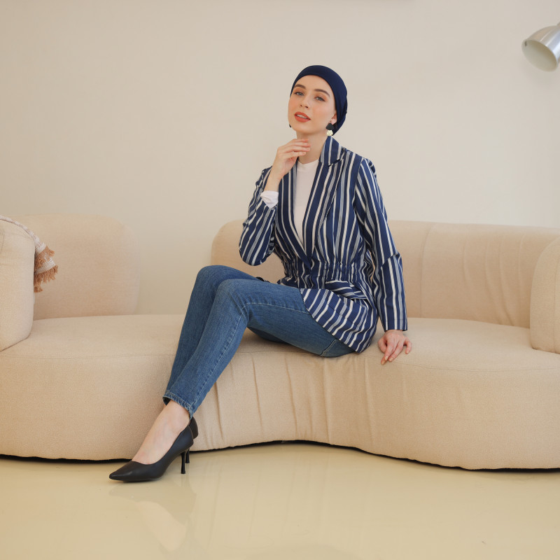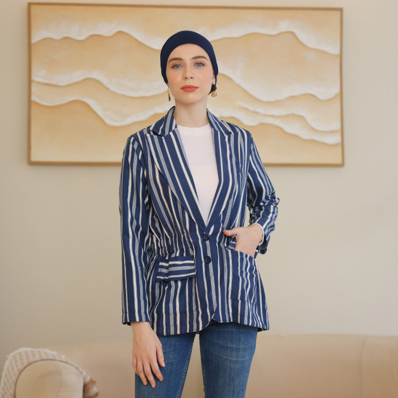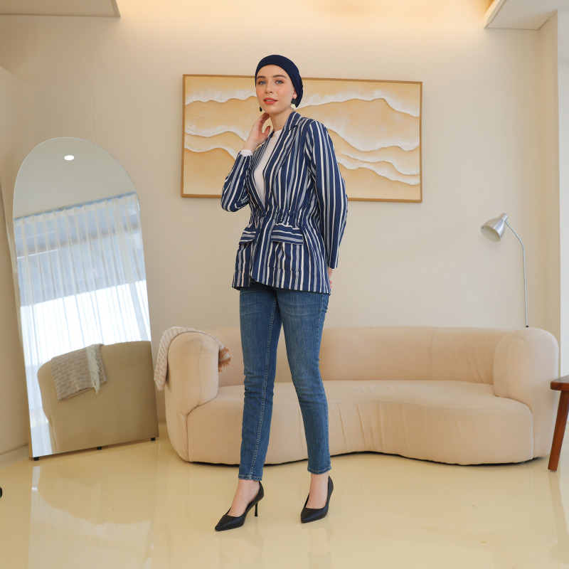Atasan model outer lengan panjang, terdapat detail smock dan saku pada bagian depan kiri, dan kanan.