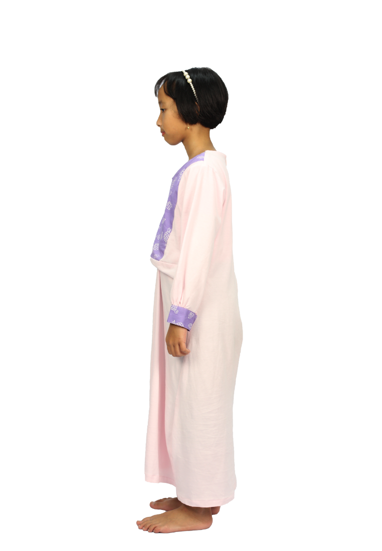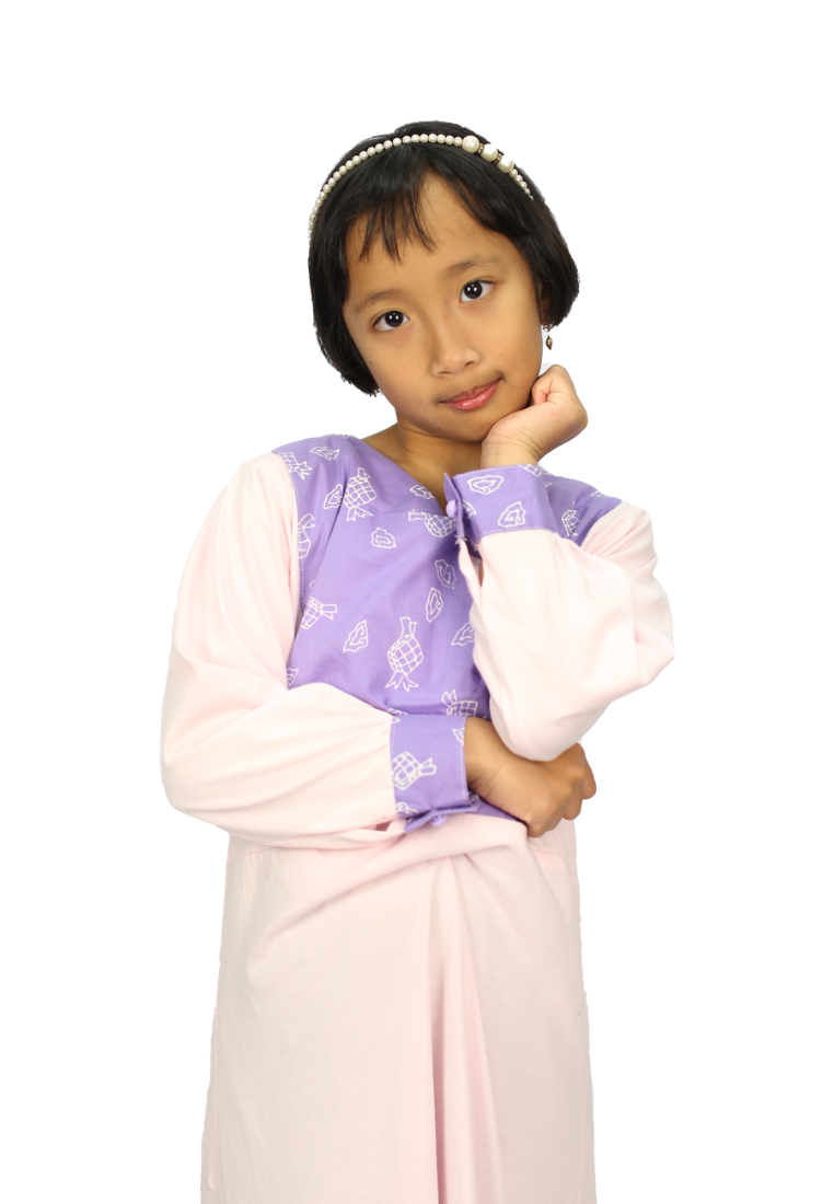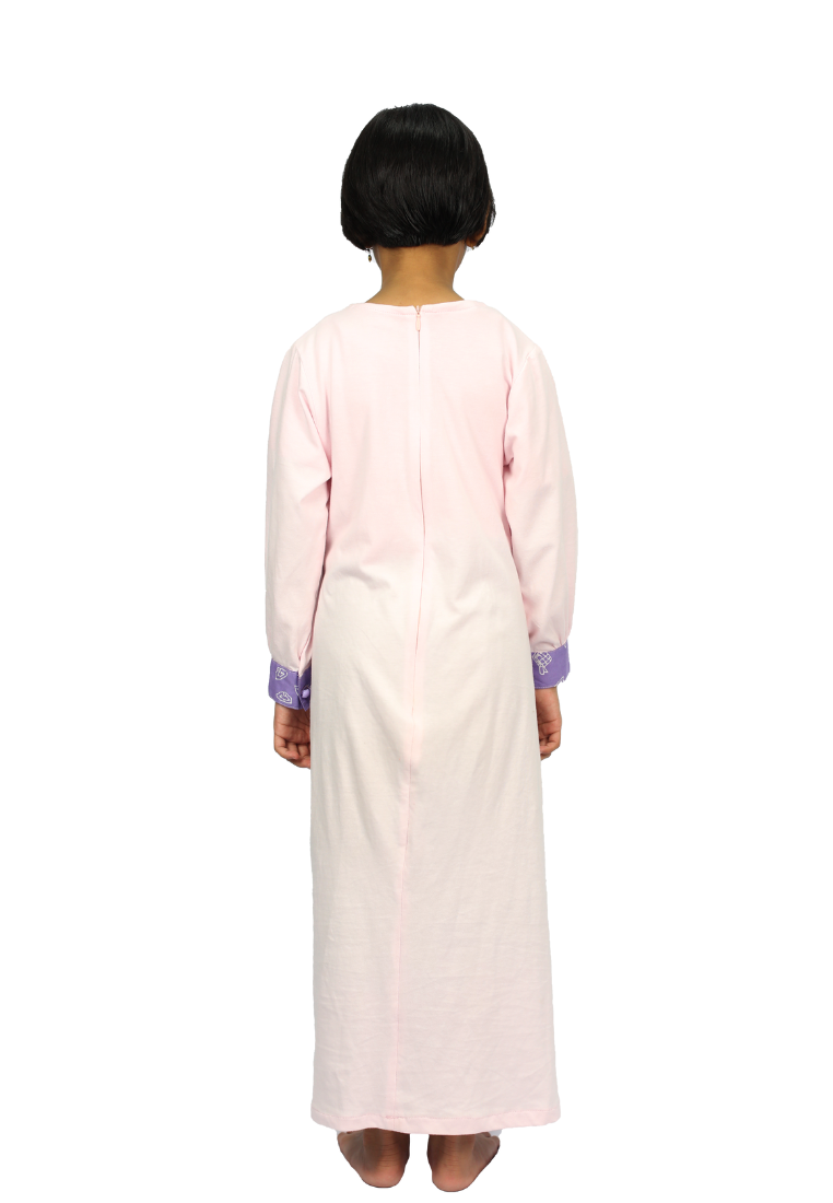 Kaftan lengan panjang yang memiliki manset kancing dan cutting leher V dengan bukaan sleting belakang. Terdapat kombinasi batik pada depan dan lengan. Serta detail lipit dibagian tengah kaftan.