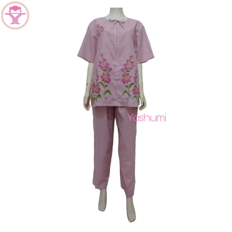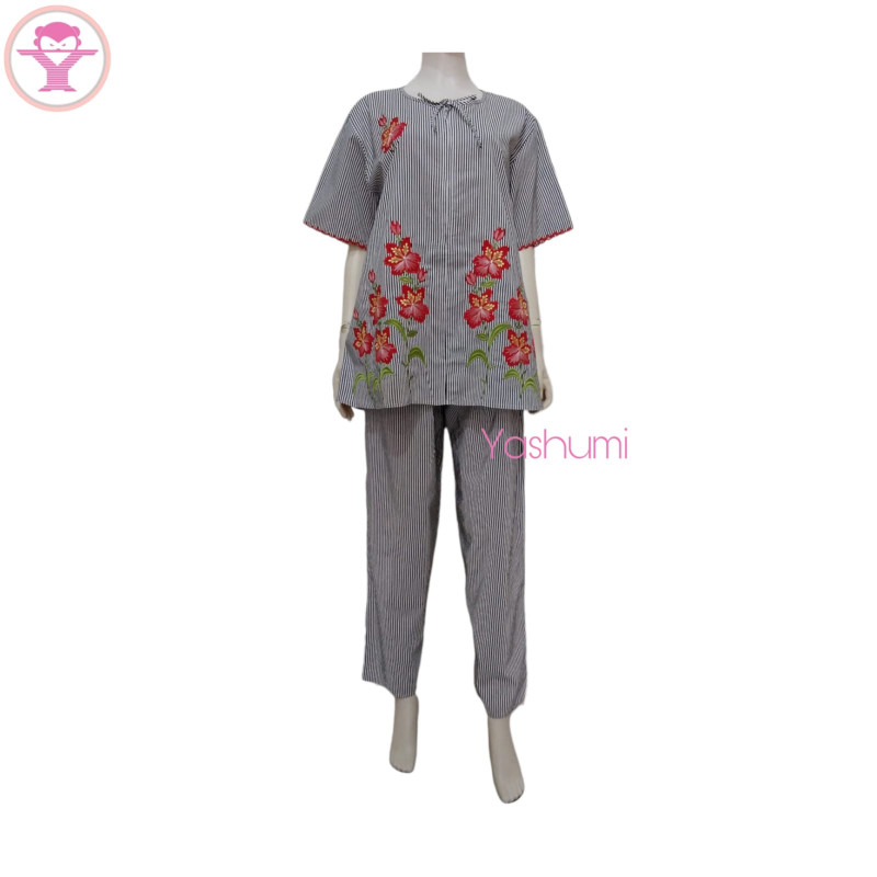 YASHUMI Piyama Bordir Malangan Babydoll Leher Bulat Restleting Katun Premium Motif Garis
