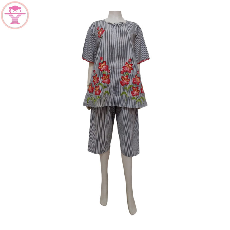 Piyama Bordir Malangan Leher Bulat Resleting Motif Garis