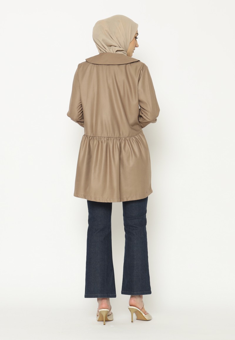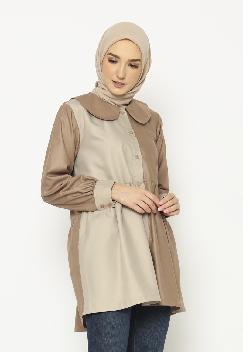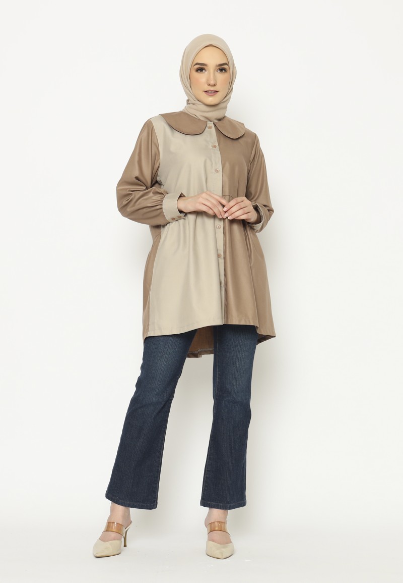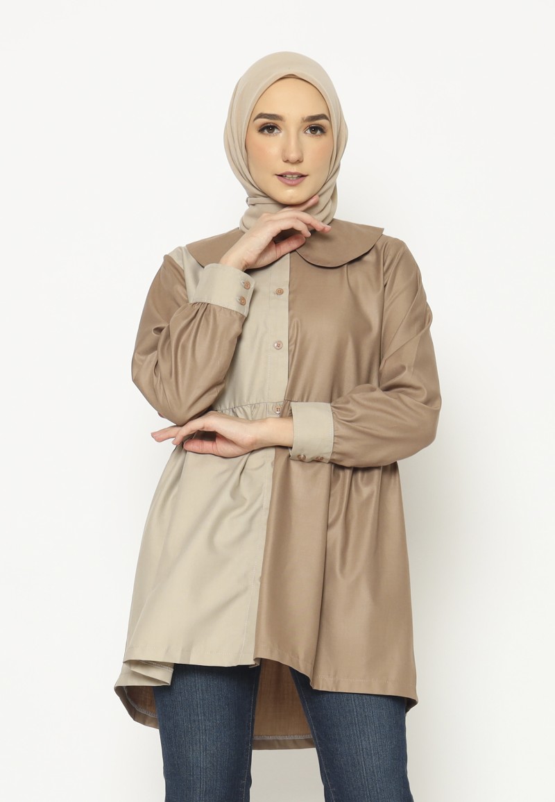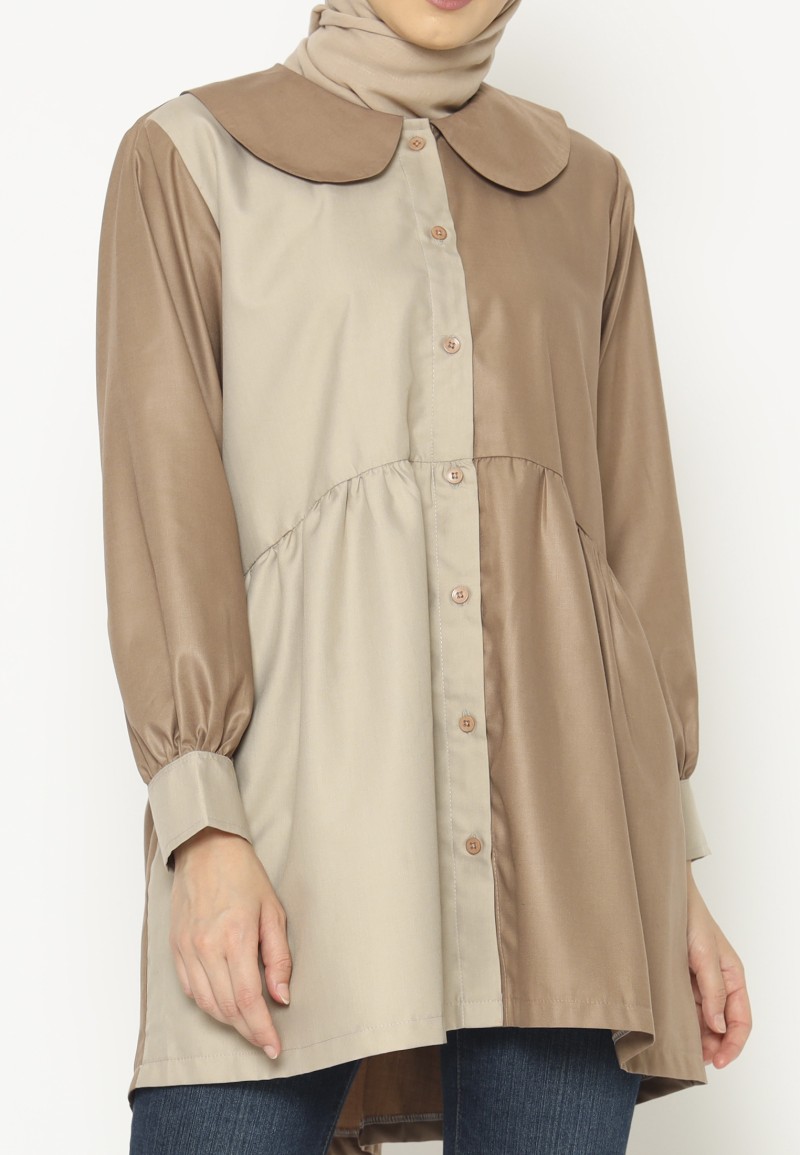 Blouse lengan panjang dengan leher peterpan. Bukaan kancing depan. Memiliki perpaduan dua warna dan lengan manset.