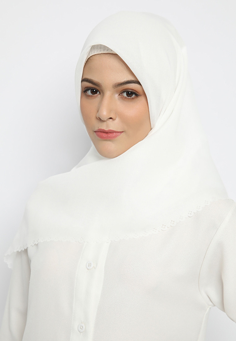 Jilbab segiempat memiliki finishing laser cut bunga yang cantik, menggunakan material voal magical yang nyaman digunakan untuk aktifitas sehari-hari. Packaging pouch yang bisa digunakan kembali.