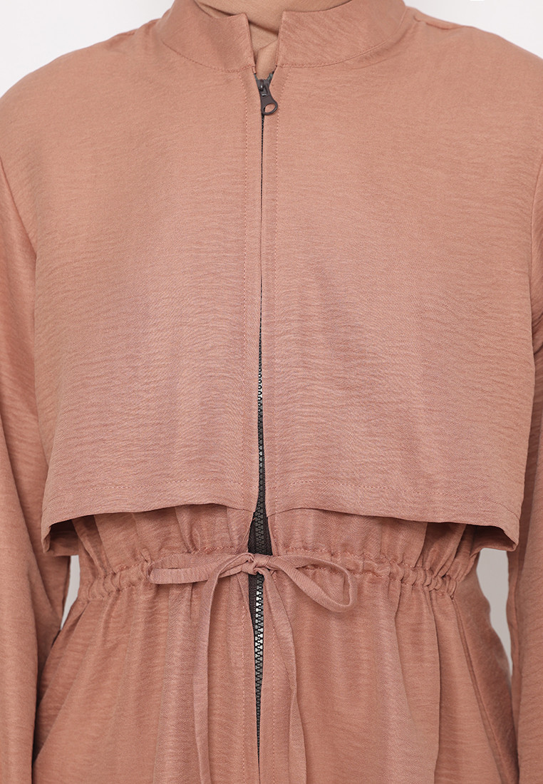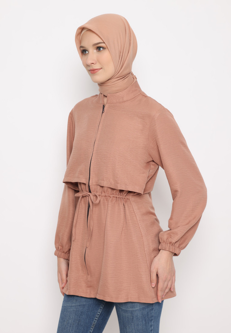 Blus beraksen drawstring dan layer style serta bukaan zipper depan.