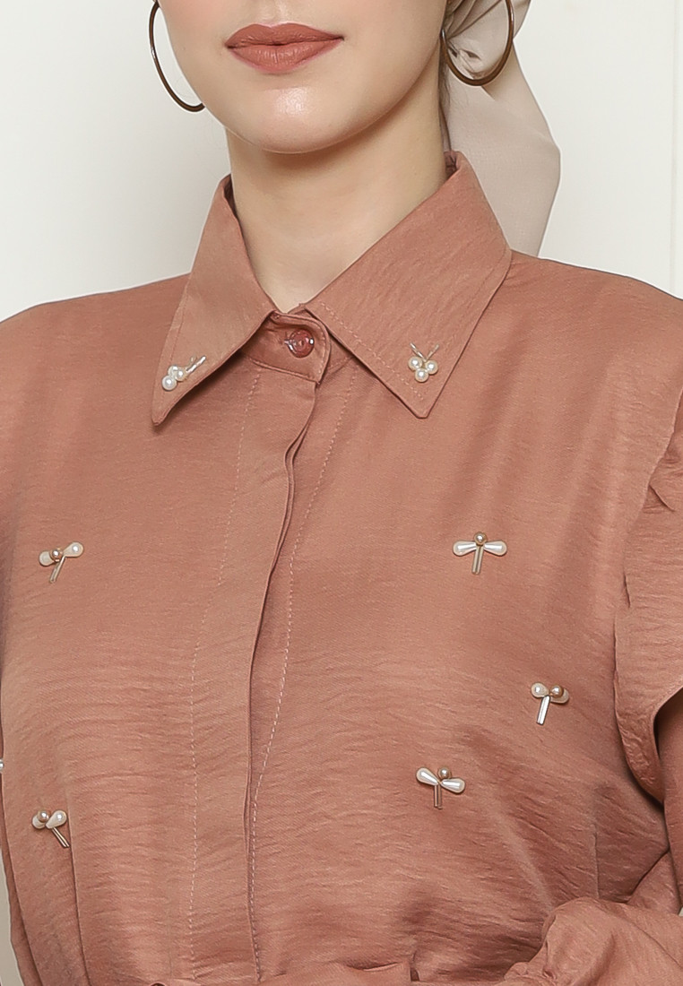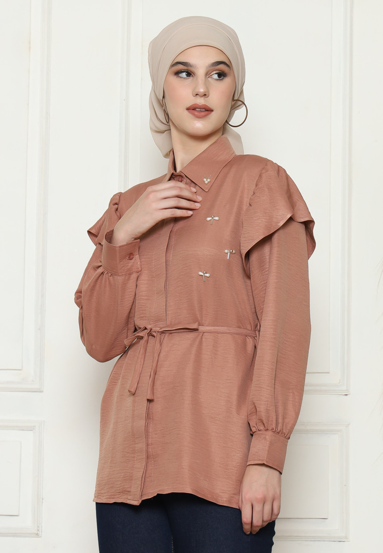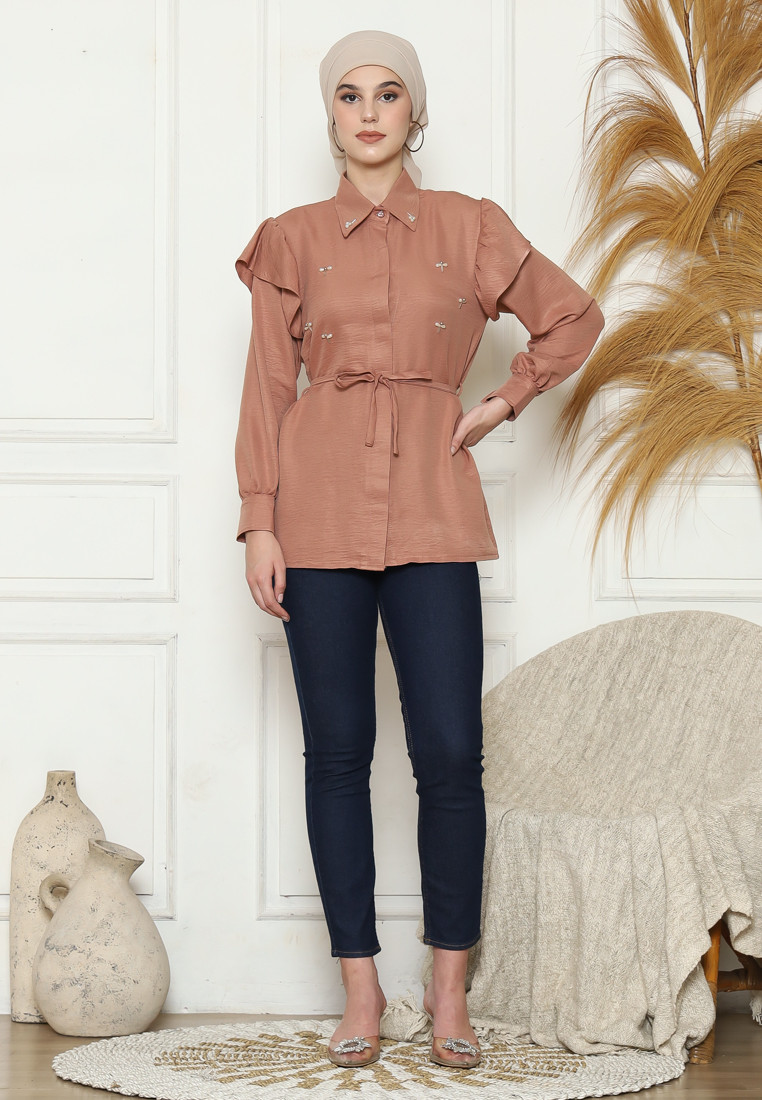 Blus lengan panjang dengan leher kerah. Memiliki bukaan kancing depan dan manset kancing, terdapat detail layer pada bagian bahu. Aksen payet pada bagian kerah dan depan blus. Memiliki tali yang dapat dilepas pasang
