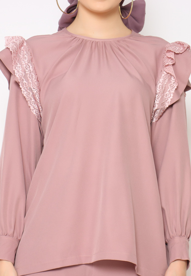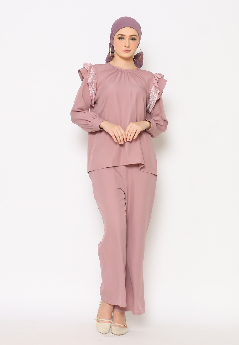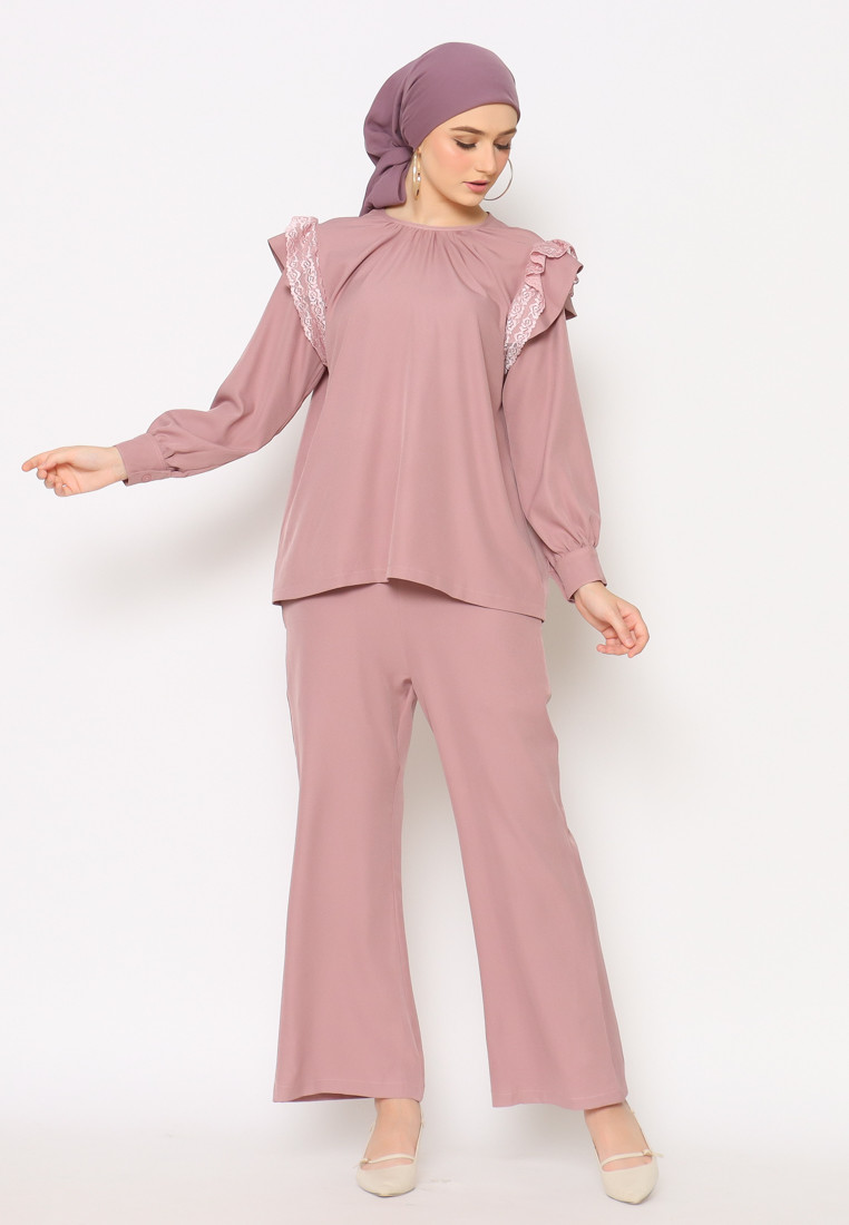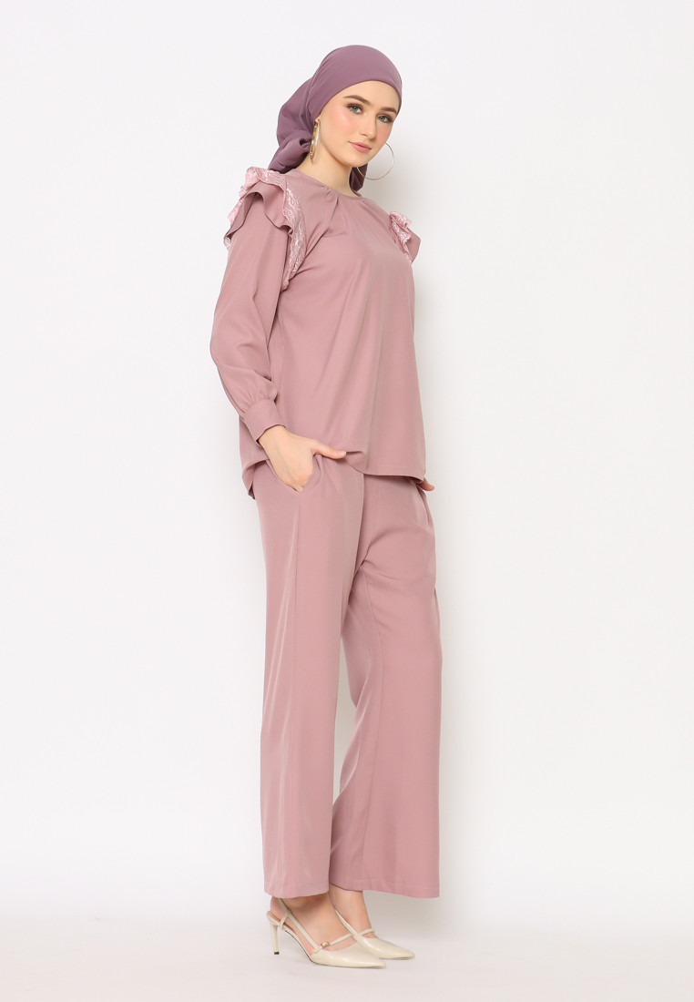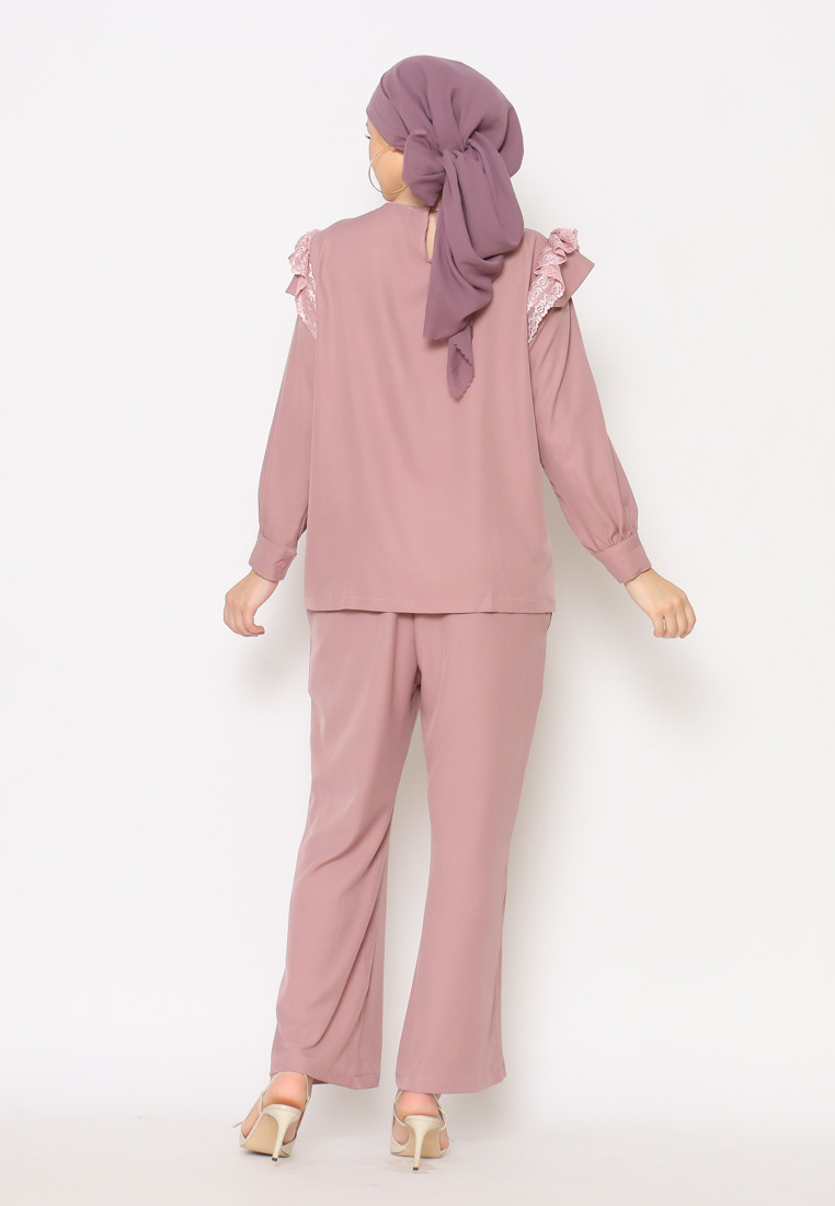 One set atasan dan bawahan yang memiliki detail leher bulat dan bukaan kancing pada bagian belakang. Terdapat detail renda pada bagian bahu