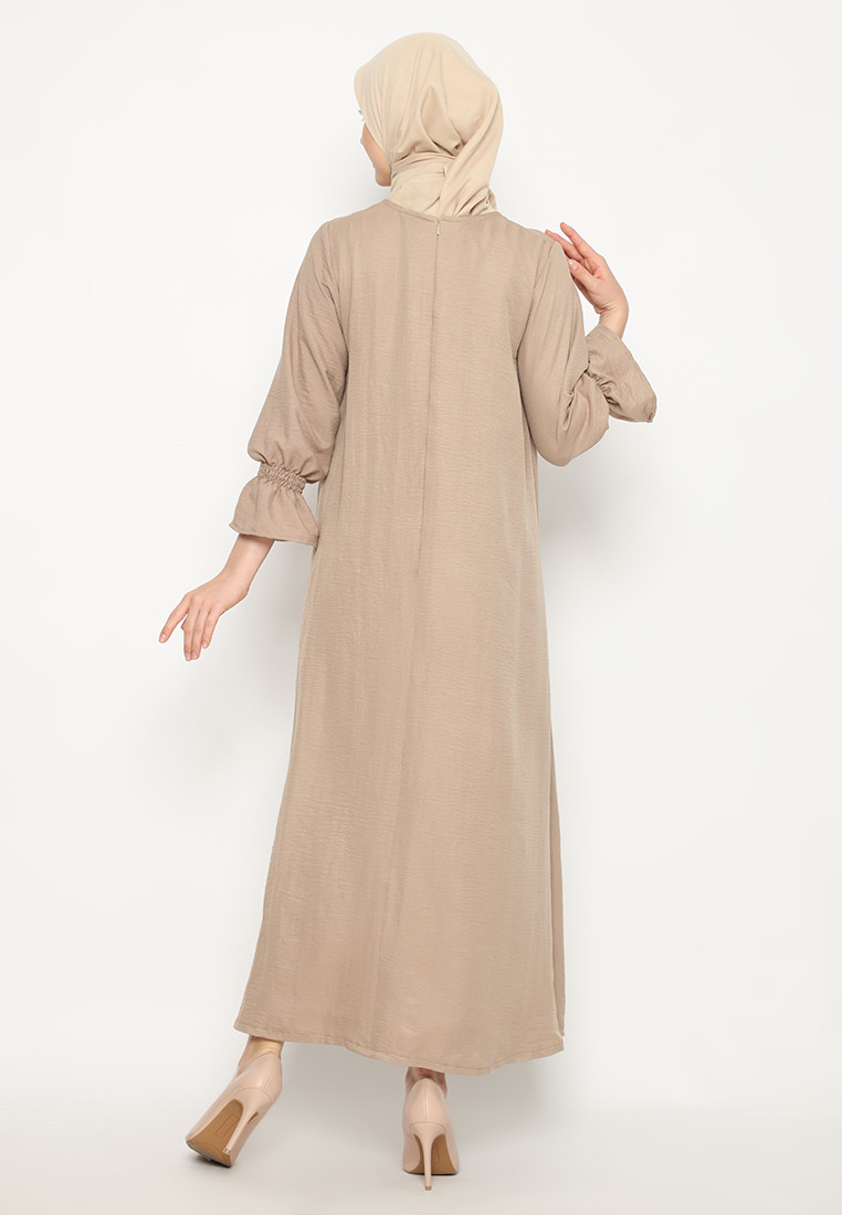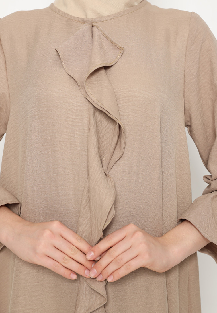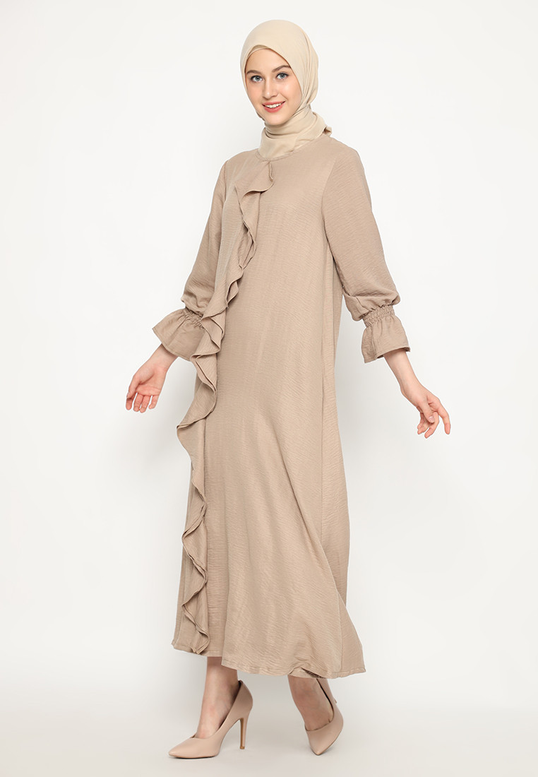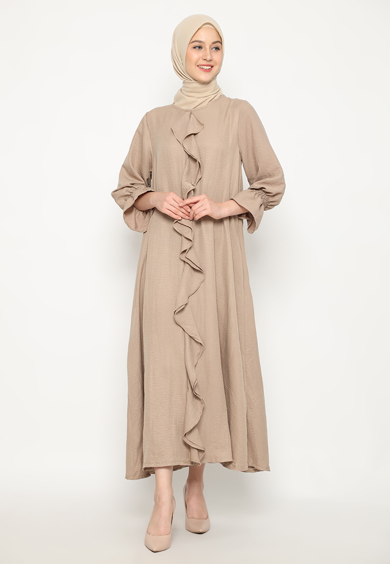 Dress lengan panjang dan leher bulat. Bukaan sleting belakang dan terdapat karet pada bagian lengan. Memiliki detail ruffles pada bagian depan dress