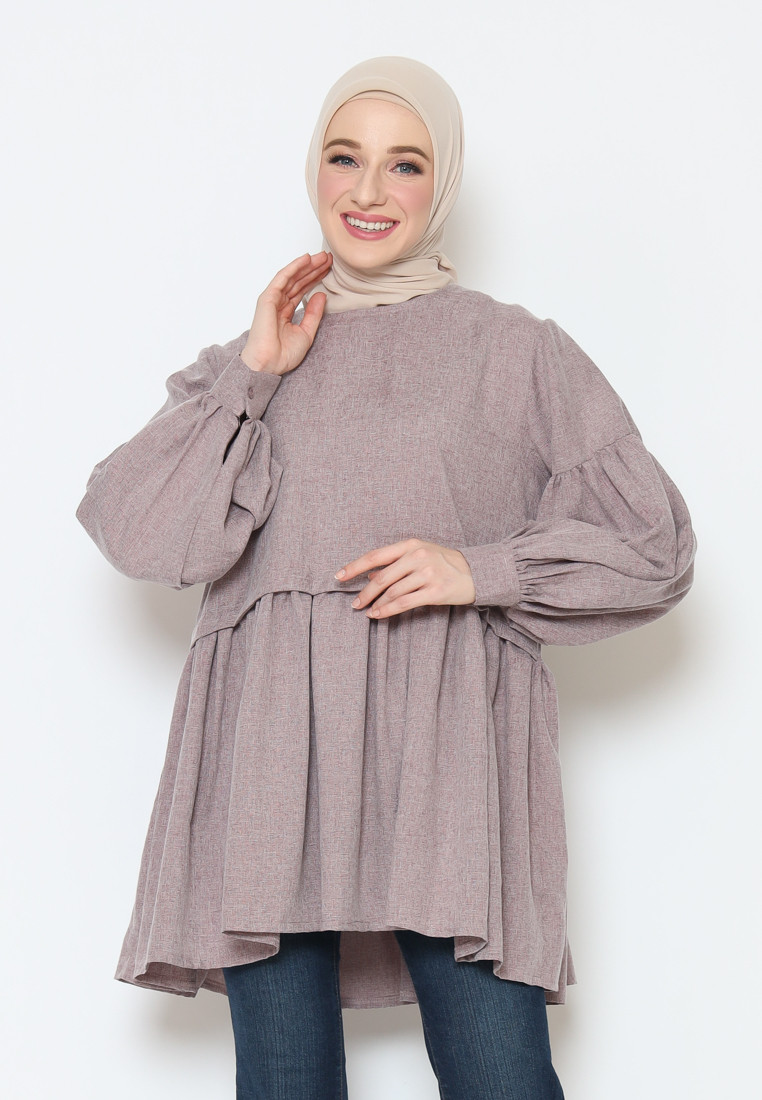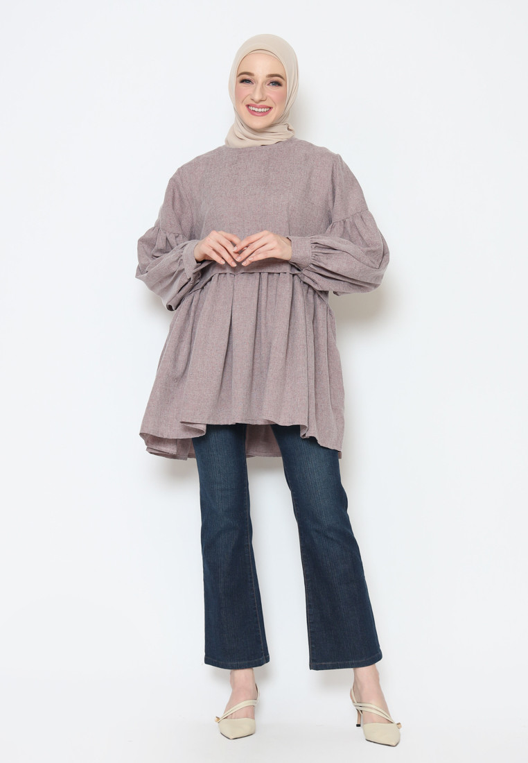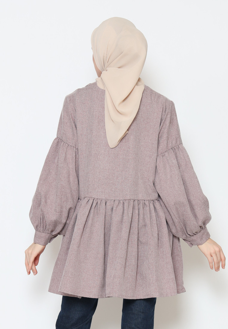 Blouse lengan panjang dengan leher bulat. Bukaan kancing belakang. Memiliki manset pada bagian lengan