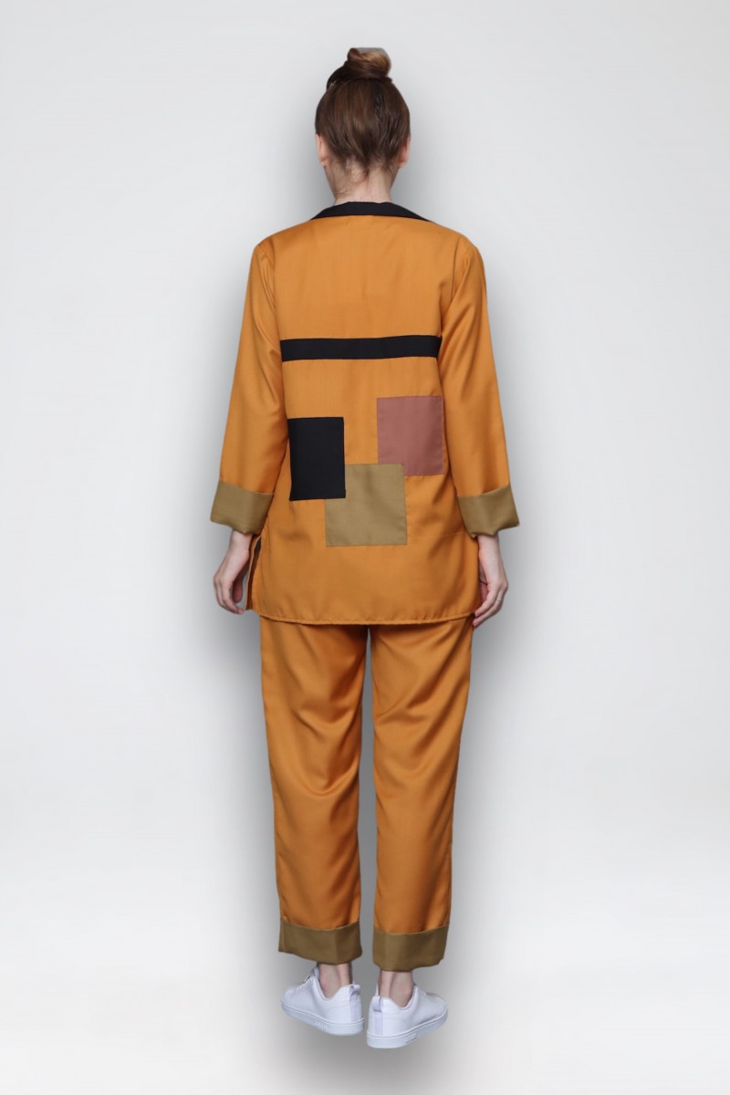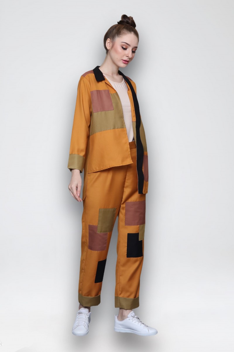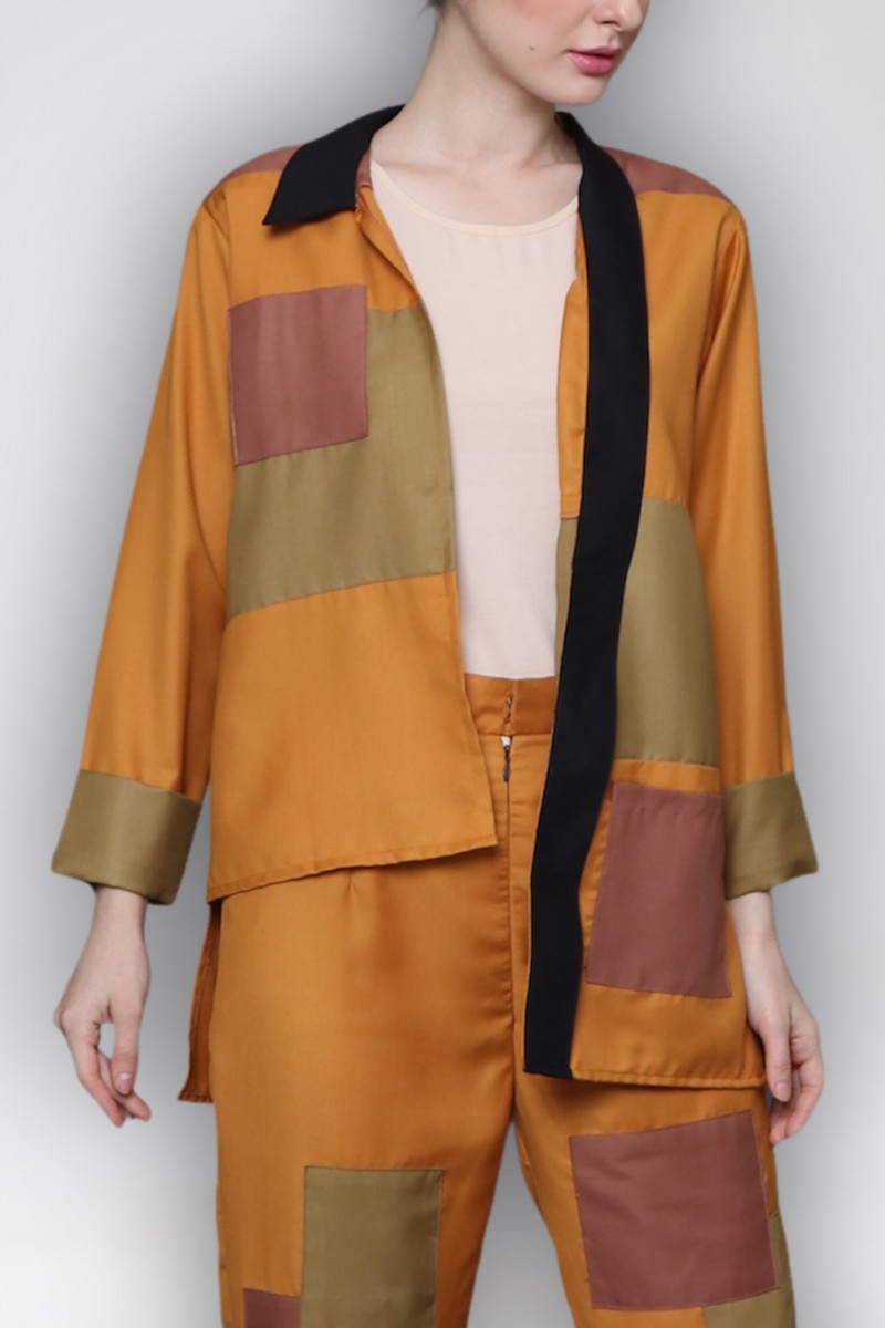 merupakan setelan outer lengan panjang berbahan katun high quality dengan detail/aksen tempelan dan bentuk kerah asimetris yang unik. Terdapat kantong fungsional.
