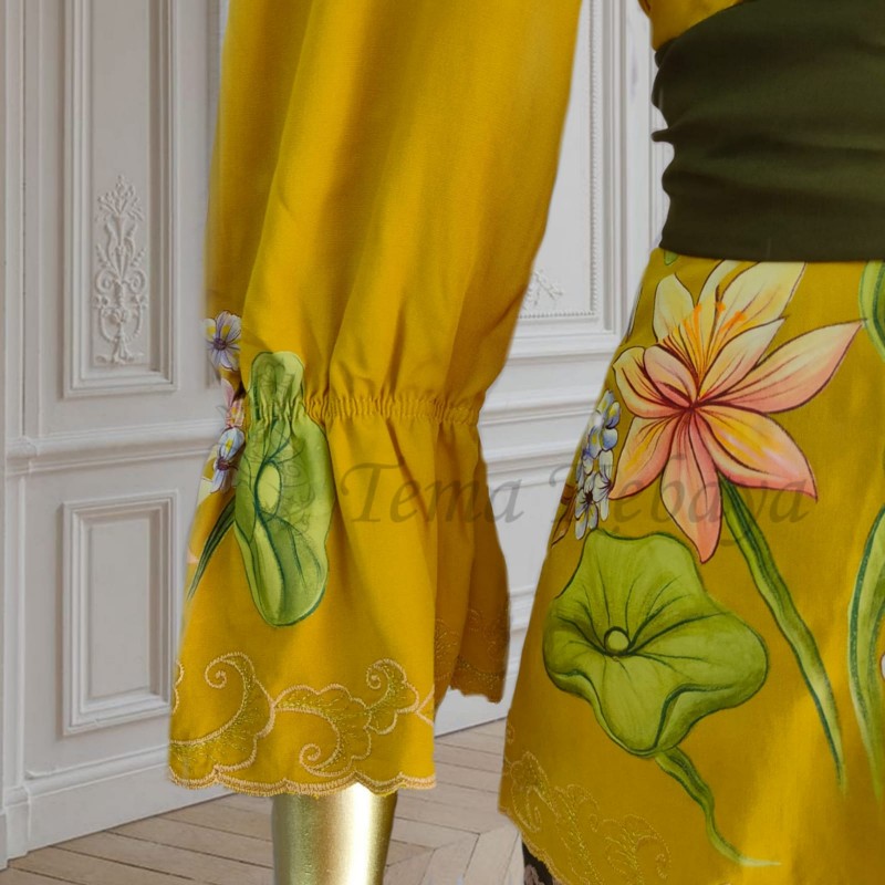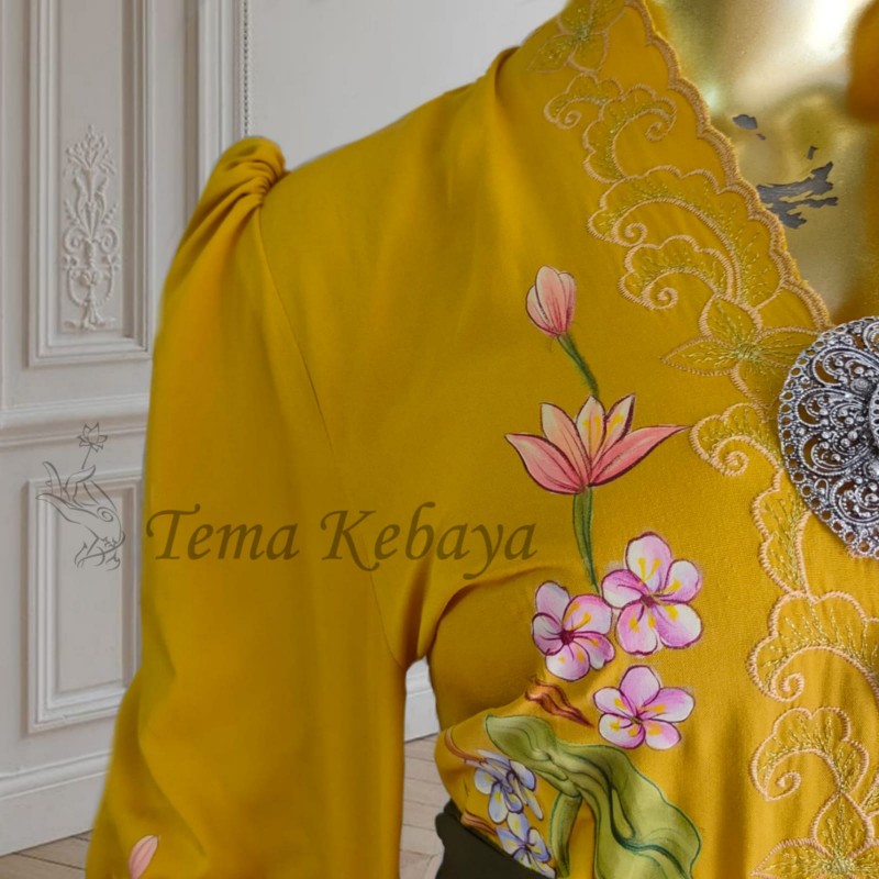 Kebaya Kuning dengan lukisan Bunga Lotus dengan bahan rayon yang sangat nyaman digunakan dalam event resmi maupun suasana pernikahan dengan menampilkan kesan tropis bunga lotus yang terlukis pada kebaya.