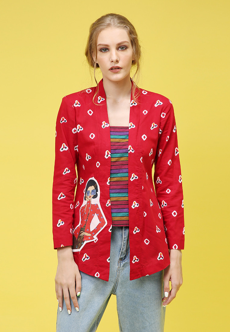 Kebaya ala Markonah dengan corak batik jumputan merah khas Jawa yang ditempel dengan ikon Markonah.