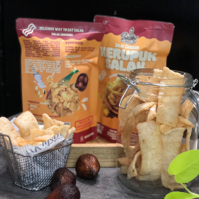 Kerupuk salak pertama yg memakai tepung bebas gluten berpadu dengan olahan salak dan udang kering/ebi dan bumbu lainnya yg membuat karakter rasa kruplak SALAKU®️ renyah gurih alami dari ebi.
