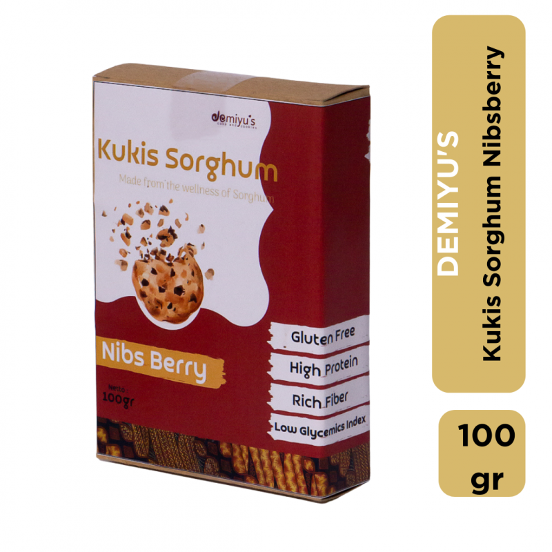 Kukis sorghum Nibsberry menggunakan coklat nibs dan cranberry sebagai kondimen utama untuk menghasilkan cemilan sehat tapi tetep enak.