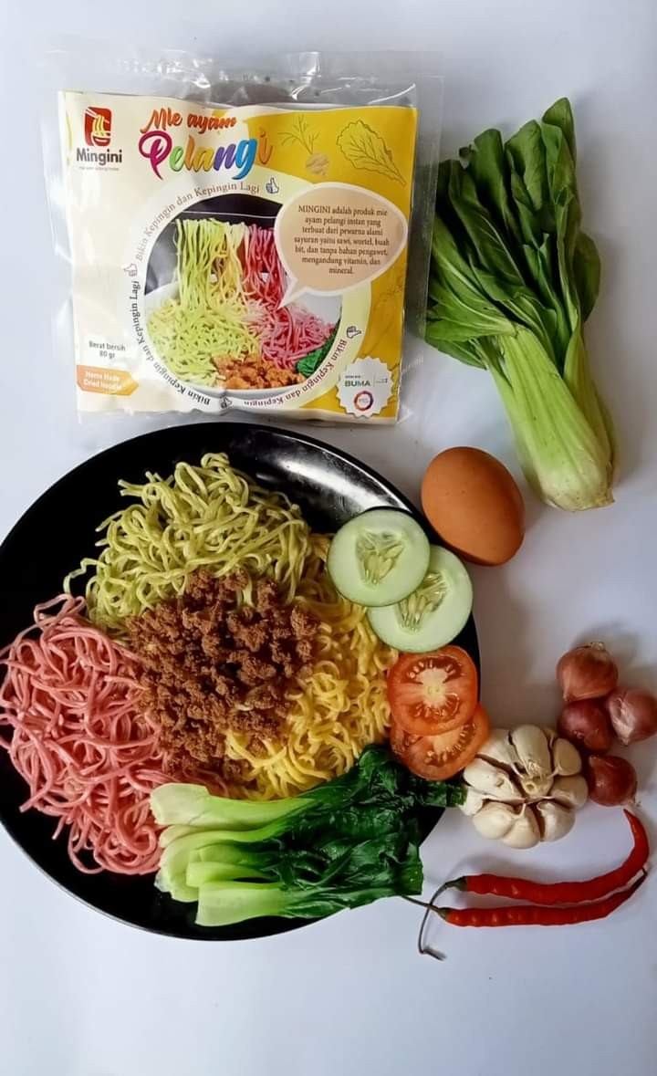 Mingini mie ayam pelangi instan yang terbuat dari pewarna alami sayuran yaitu sawi,wortel,buah bit dan tanpa bahan pengawet