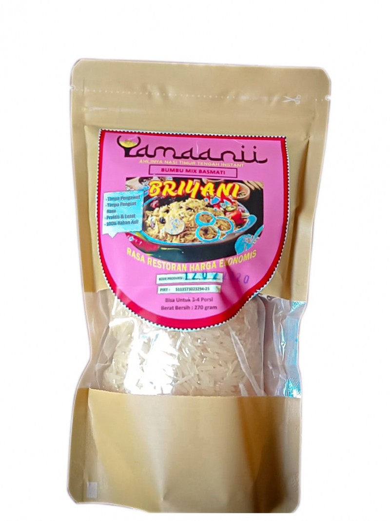 Yamaanii ahlinya bumbu masak instant khas Timur Tengah dengan akulturasi selera Indonesia. Detail pack : √ Beras Basmati bervacum √ Bumbu kering √ Porsi 4-5 orang √ Cara memasak pada kemasan √ Berat 300 gr Yamaanii terdiri dari 4 varian : √ Yamaanii Mandi √ Yamaanii Kabsah √ Yamaanii Kebuli √ Yamaanii Biryani Yuk buruan di order. Nikmati makanan masakan arab tanpa ribet, enak dan sehat...harga ekonomis rasa restoran