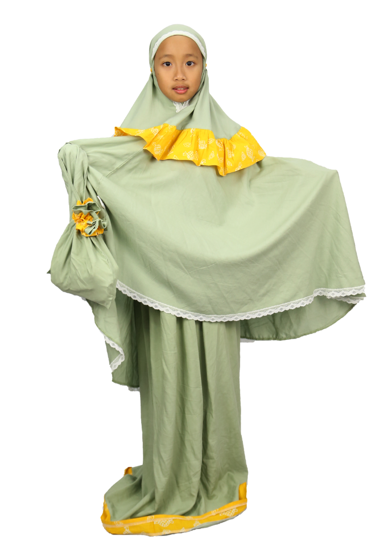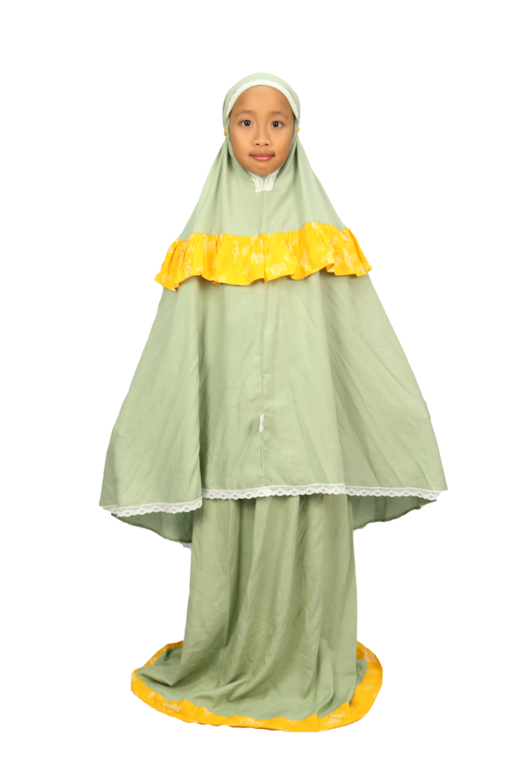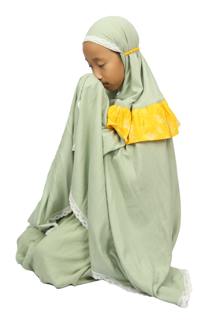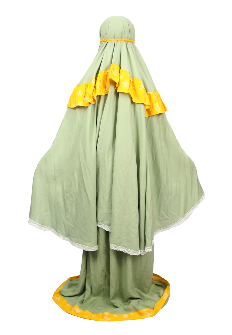 Satu set mukena atasan dan bawahan berwarna sage memiliki detail renda dan batik dengan tali karet pada bagian kepala. Dilengkapi dengan pouch.