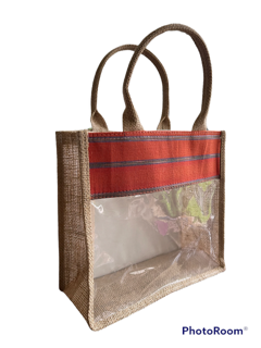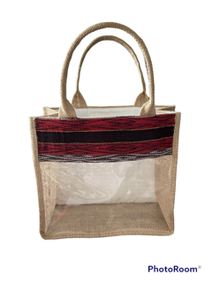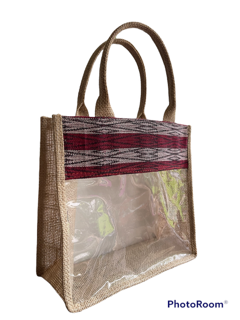Tas Hampers yang terbuat dari Bahan karung goni laminating dan Plastik Mika, dilapis dengan kain kampas dan bagian luar dipercantik dengan sentuhan kain tenun Balige.