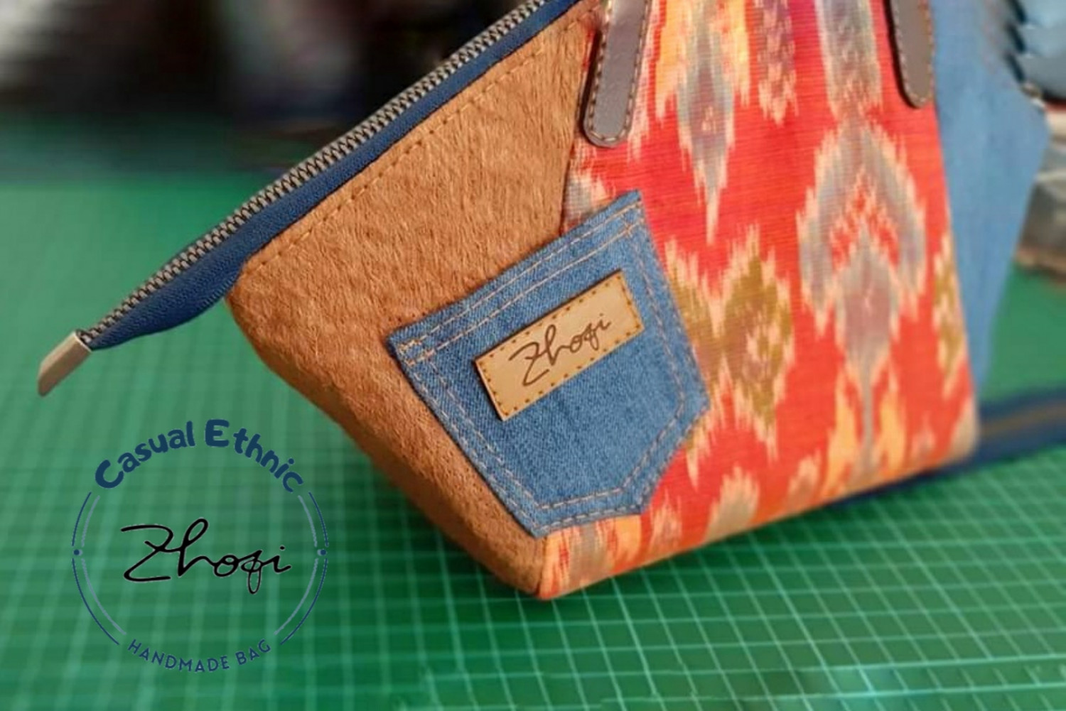 Dengan kain khas daerah Palembang, yaitu kain jumputan maupun tenun blongsong katun dan semi sutera, dipadu padankan dengan bahan jeans dan kulit kayu dari Sumatera Selatan.
