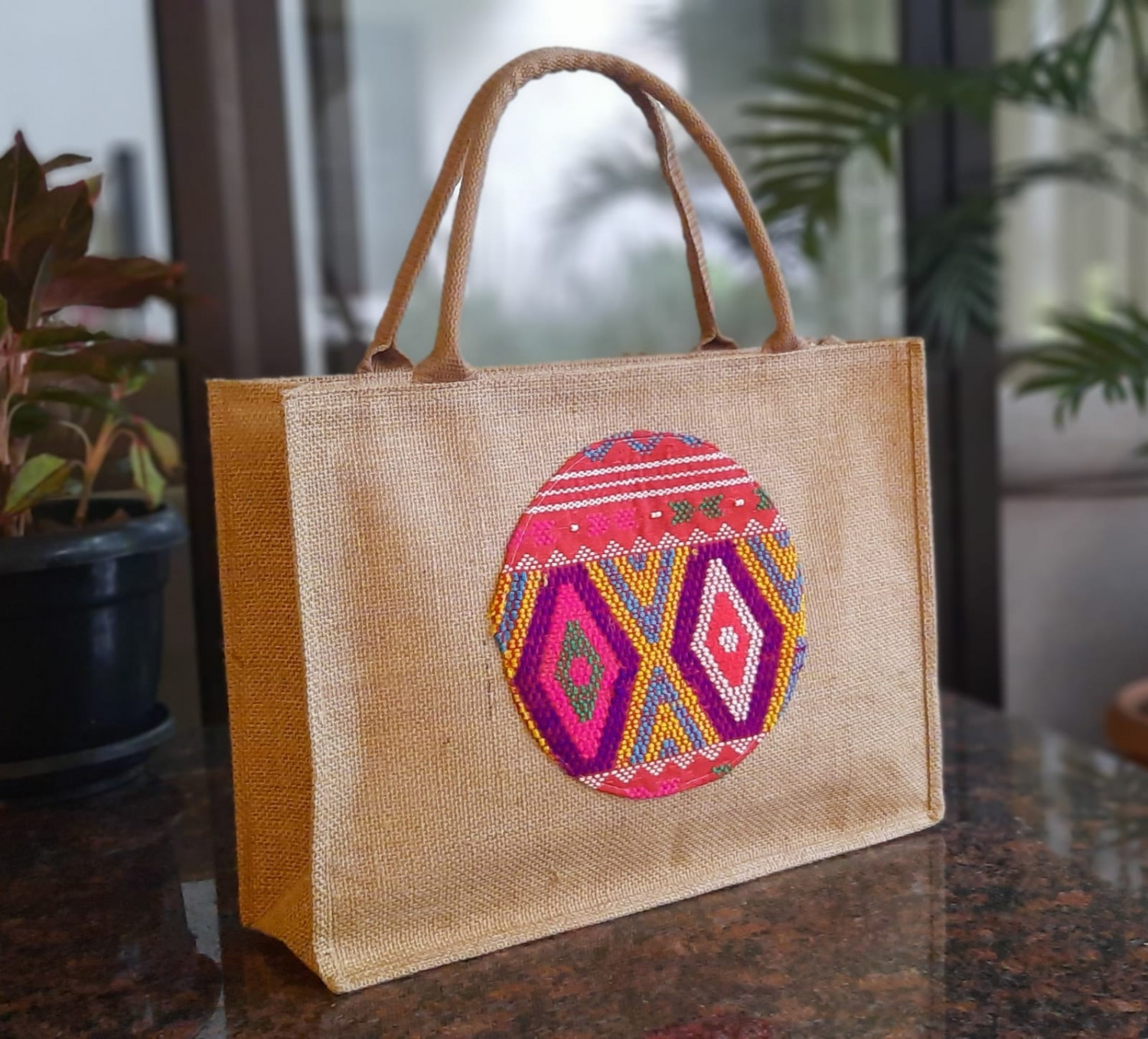 Tas ini dikombinasikan dengan Kain Ulos Batak Motif Sadum yang mengandung makna filosifis akan harapan yang baik untuk masa yang akan datang (optimisme)